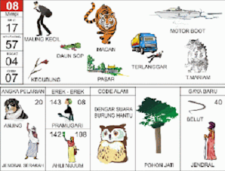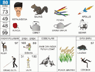 | 80 = 73 - 49 - 48 - 99 Kepala Desa - Bajing - Apollo - Pensil - Ceret - Semar <=> Angka Pelarian = 97 <=> Gaya Baru = 57 <=> Kode Alam = Anak dan Induk Puyuh Lewat |