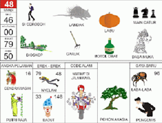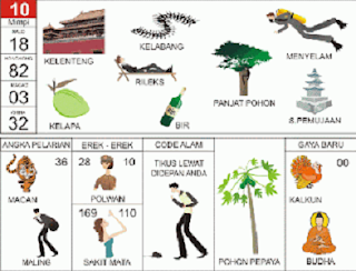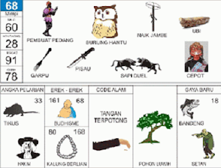 | 60 = 68 - 32 - 93 - 82 Kepala Polisi - Cecak - Karambol - Delima - Handuk - Sentiyaki <=> Angka Pelarian = 73 <=> Gaya Baru = 35 <=> Kode Alam = Orang Barat Tawar Buah |