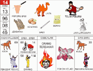 | 96 = 98 - 14 - 63 “ 64 Prajurit - Ikan Nus - Laut - Mangga - Minyak Angin - Citrayuda <=> Angka Pelarian = 55 <=> Gaya Baru = 48 <=> Kode Alam = Bunuh Ayah |