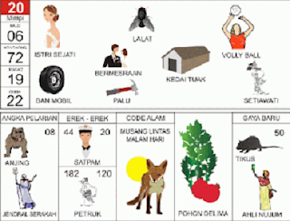 | 20 = 06 - 72 - 19 - 22 Istri Sejati - Lalat - Volley ball - Palu - Ban Mobil - Setiawati <=> Angka Pelarian = 08 <=> Gaya Baru = 50 <=> Kode Alam = Musang melintas Malam hari |