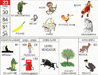 | 23 = 30 - 84 - 81 - 34 Setan Gantung - Kera - Bola Basket - Pisang - Piano - Wilkampana <=> Angka Pelarian = 91 <=> Gaya Baru = 53 <=> Kode Alam = Lembu Mengamuk |