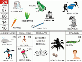 | 24 = 07 - 66 - 14 - 16 Sumber Air - Katak - Tenis Meja - Sikat Gigi - Padi - Dewa Ruci <=> Angka Pelarian = 09 <=> Gaya Baru = 31 <=> Kode Alam = Sepasang Merpati Terbang |