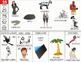 | 35 = 25 - 75 - 52 - 02 Wanita - Kambing - Tinju - Lambung - Jalan Jalan - Drupadi <=> Angka Pelarian = 50 <=> Gaya Baru = 60 <=> Kode Alam = Dompet Jatuh |