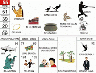 | 55 = 51 - 39 - 20 - 89 Pertapa - Kangguru - Kasti Gelang - Kemaron - Rd Seta <=> Angka Pelarian = 96 <=> Gaya Baru = 52 <=> Kode Alam = Nenek dan Kakek Jalan Berdua |