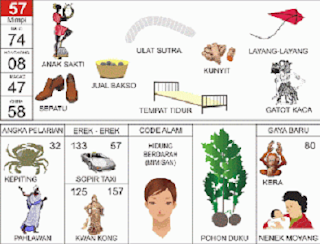 | 57 = 74 - 08 - 47 - 58 Anak Sakti - Ulat Sutera - Layang Layang Sepatu - Ranjang - Gatotkaca <=> Angka Pelarian = 32 <=> Gaya Baru = 80 <=> Kode Alam = Hidung Berdarah (Mimisan) |