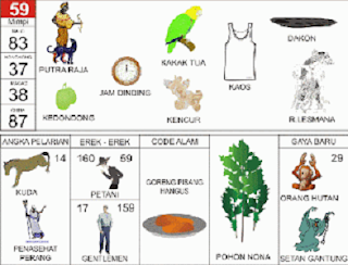 | 59 = 83 - 37 - 38 - 87 Putra Raja “ Kakak Tua - Dakon - Kedondong - Kaos “ Rd Lesmana <=> Angka Pelarian = 14 <=> Gaya Baru = 29 <=> Kode Alam = Goreng Pisang Hangus |