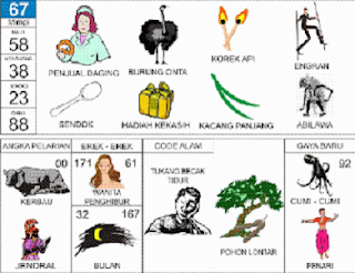 | 67 = 58 - 38 - 23 - 88 Penjual Daging - Burung Onta - Engrang - Sendok - Korek Api - Abilawa <=> Angka Pelarian = 00 <=> Gaya Baru = 92 <=> Kode Alam = Tukang Becak Tidur |