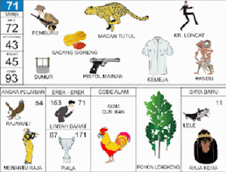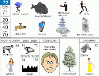 | 72 = 71 - 20 - 40 - 70 Dewa Langit - Ikan Terbang - Ik Ol - Kran Air - Arloji - Betara Guru <=> Angka Pelarian = 42 <=> Gaya Baru = 22 <=> Kode Alam = Pedagang Kain Marah |