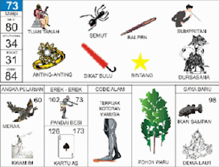 | 73 = 80 - 34 - 31 - 84 Tuan Tanah - Semut - Tulupan - Anting Anting - Bintang - Dursasana <=> Angka Pelarian = 60 <=> Gaya Baru = 98 <=> Kode Alam = Terpijak Kotoran Manusia |