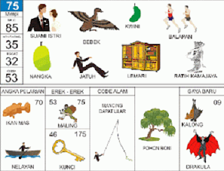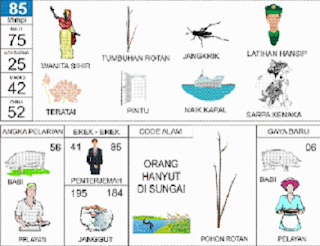 | 85 = 75 - 25 - 42 - 52 Wanita Sihir - Jangkrik - Latihan Hansip - Teratai - Pintu - Sarpakenaka <=> Angka Pelarian = 56 <=> Gaya Baru = 06 <=> Kode Alam = Orang Hanyut di Sungai |