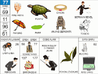 | 77 = 69 - 11 - 96 - 61 Walikota - Penyu “ Bekel Cincin - Payung - Togog <=> Angka Pelarian = 26 <=> Gaya Baru = 02 <=> Kode Alam = Pemain Sulap di pinggir Jalan |