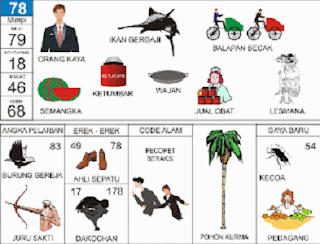 | 78 = 79 - 18 - 46 - 68 Orang Kaya - Ikan Gergaji Balap Becak - Semangka - Wajan - Lesmana Mandrakumara <=> Angka Pelarian = 83 <=> Gaya Baru = 54 <=> Kode Alam = Pencopet Beraksi |