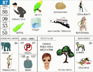 | 87 = 88 - 09 - 33 - 59 Orang Gila - Betet - Kerja Bakti - Botol - Toilet - Buriswara <=> Angka Pelarian = 94 <=> Gaya Baru = 36 <=> Kode Alam = Orang Pakai Kacamata Hitam |