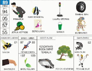 | 89 = 94 - 05 67 - 55 Pemabuk - Ikan Bendera - Setopan - Jeruk Keprok - Ember - Bomanarakasura <=> Angka Pelarian = 61 <=> Gaya Baru = 62 <=> Kode Alam = Kendaraan Roda Empat Terbalik |
