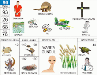 | 90 = 93 - 26 - 68 - 76 Tawanan - Trenggiling - Perempatan Jalan - Pil - Ke Pasar - Sawah - Shinta <=> Angka Pelarian = 12 <=> Gaya Baru = 43 <=> Kode Alam = Wanita Gundul |