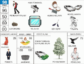 | 98 = 96 - 50 - 69 - 00 Penjaga Malam - Tongkol - TV - Lengkeng - Kecelakaan - Trijati <=> Angka Pelarian = 25 <=> Gaya Baru = 73 <=> Kode Alam = Pohon Tumbang Terhalang Jalan |